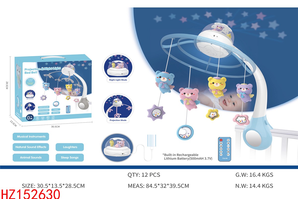 投影夜灯婴儿床铃(内置锂电池可USB充电,升级大固定架)马卡龙粉蓝
